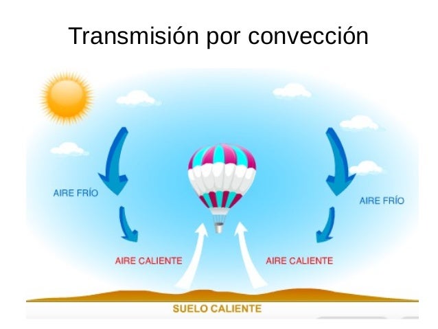 Convección: La transmisión por convección es típica de los fluidos (líquidos y gases). En ella se produce un transporte de energía asociado al desplazamiento de masas de fluido dentro del propio fluido, debido a las diferencias de densidad originadas por las distintas temperaturas de unas zonas y otras.