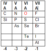 Por otro lado, para los NO METALES, el estado de oxidación más probable cuando se comportan como iones monoatómicos, (cuando no están combinados con oxígeno), se obtiene restando 8 unidades al número de grupo, en el cual, se encuentra ubicados. Así que,